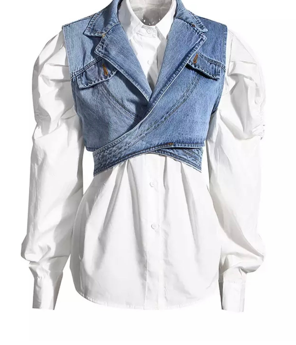 An adorable shirt set for the denim lover. Sleeveless denim vest with straps layered a top an oversized white shirt with puff sleeves. Two pieces in one.
