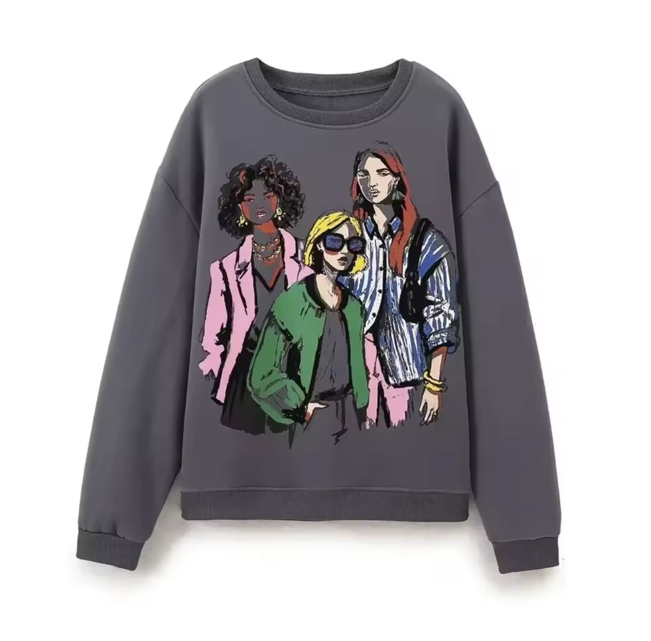 Trendy graphic sweatshirt featuring a bold, artsy print of stylish women. Soft, cozy fabric with an oversized fit — perfect for adding personality to any casual look.