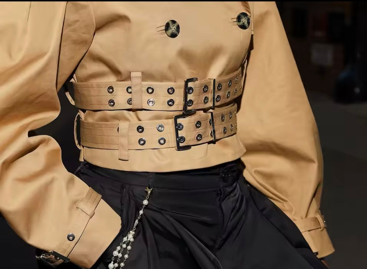 The jacket is a timeless wardrobe staple that will see you through every season. It features a double-breasted button closure, iconic puff sleeves in a curved design with an adjustable eyelet belt detail, and two adjustable, removable belts at the waist.