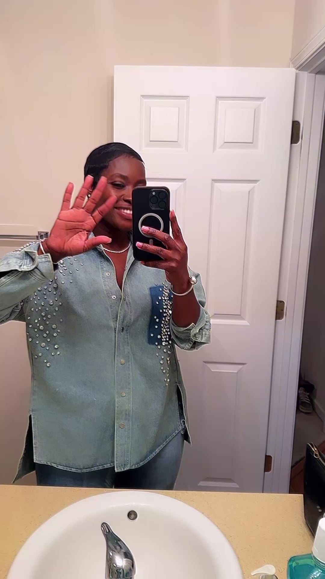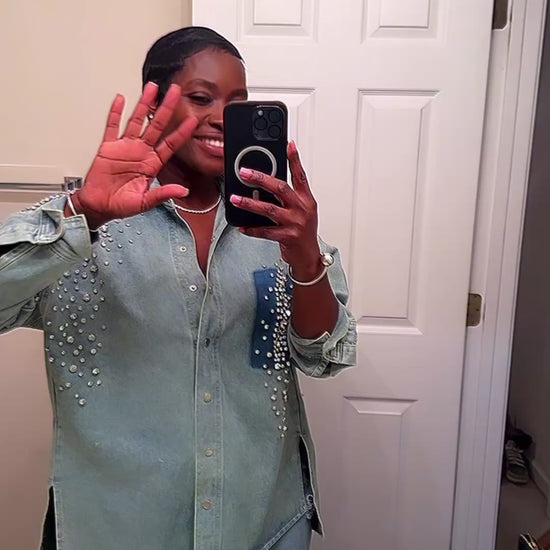 Oversized Made from soft washed denim with statement crystal embellishments across the shoulder and pocket, this piece blends casual with luxury perfectly. The relaxed fit makes it easy to dress up or down..
